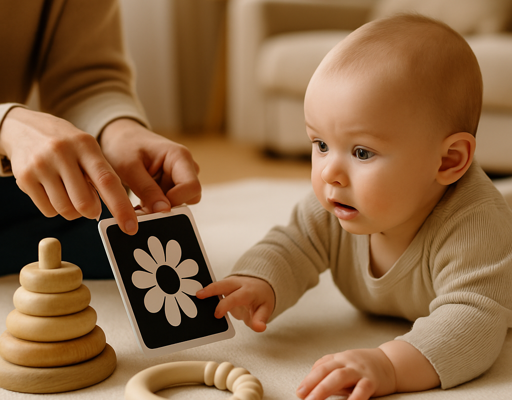 - Black-and-White-Karten: Stimulieren Sehen und Fokus. Kurze Sessions, direkter Blickkontakt.