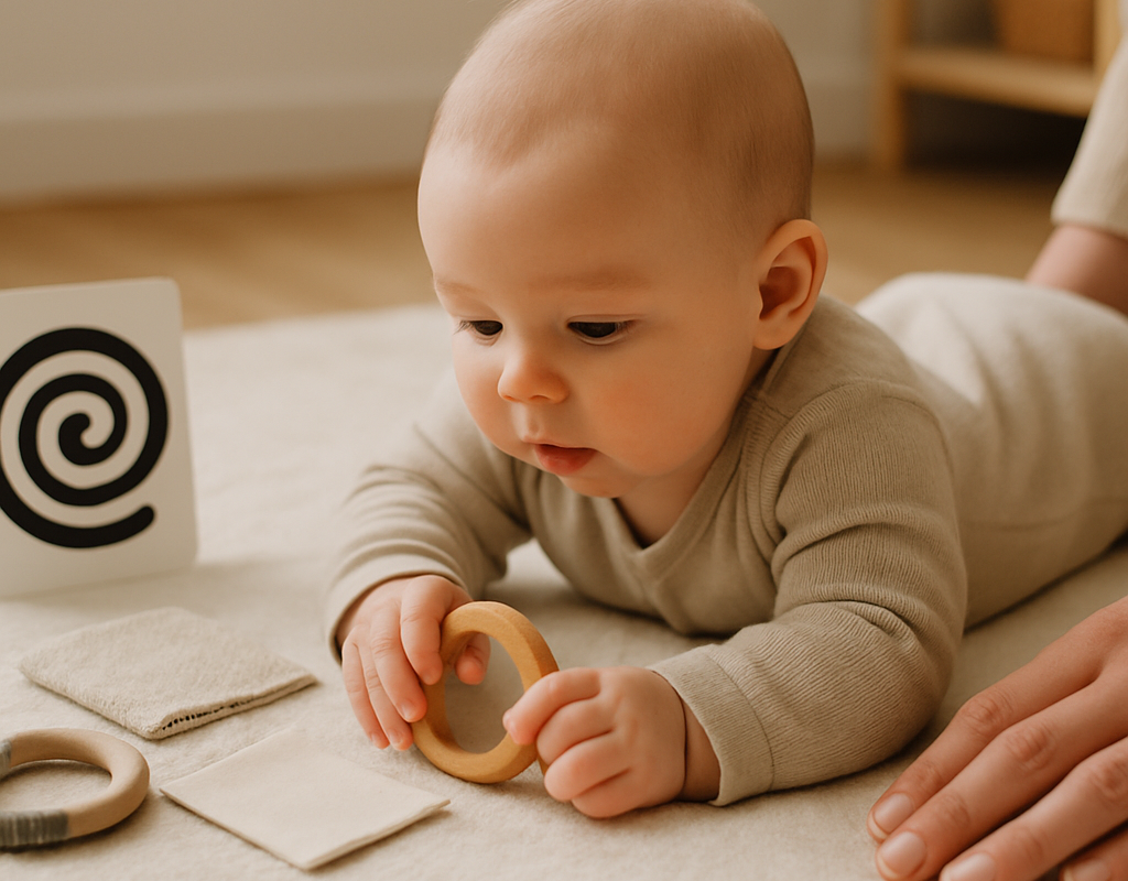 Lege eine kleine Matte bereit und platziere kontrastreiche Karten (Schwarz-Weiß-Muster) in Blickhöhe. Halte einen leichten Greifling bereit. Ziel: Visuelle Fokussierung und erste Greifversuche. Dauer: 2–5 Minuten, mehrmals am Tag.